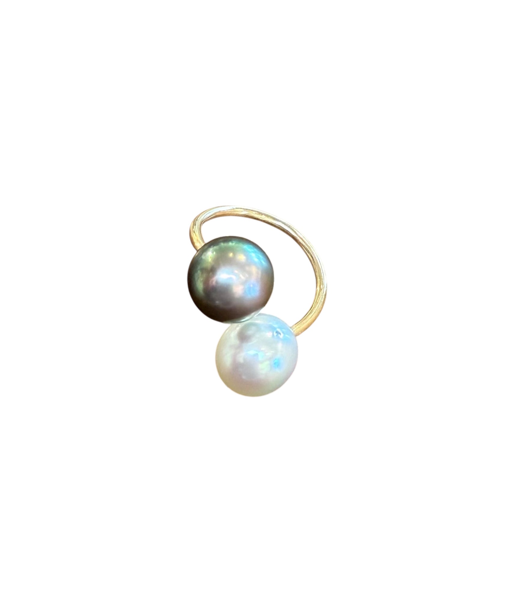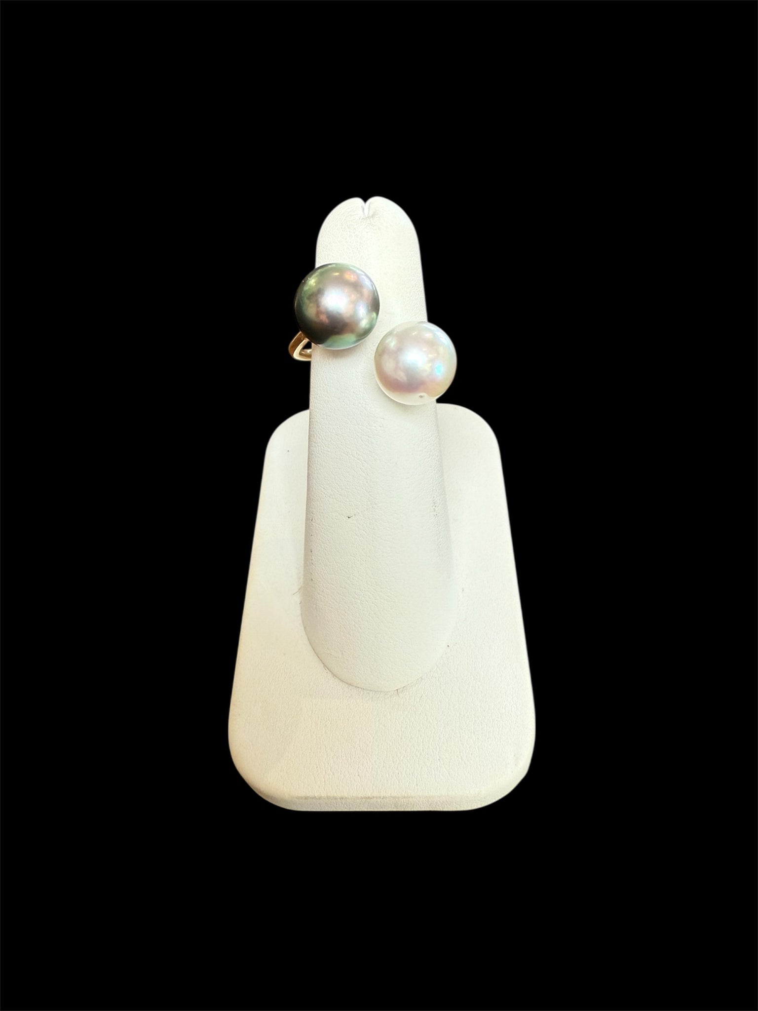 solid 14K Yellow Gold By-Pass Style Ring set with Two Fine Pearls, One Natural Colored Cultured Tahitian Pearl and a Fine White Burmese Pearl.